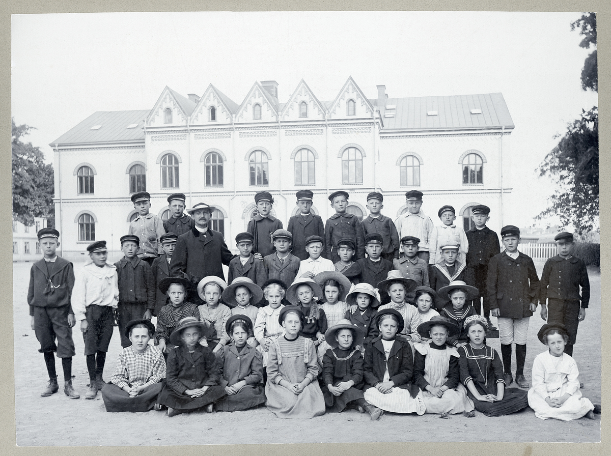 En folkskoleklass med klassföreståndare på skolgården till Norrtullskolan, Växjö.