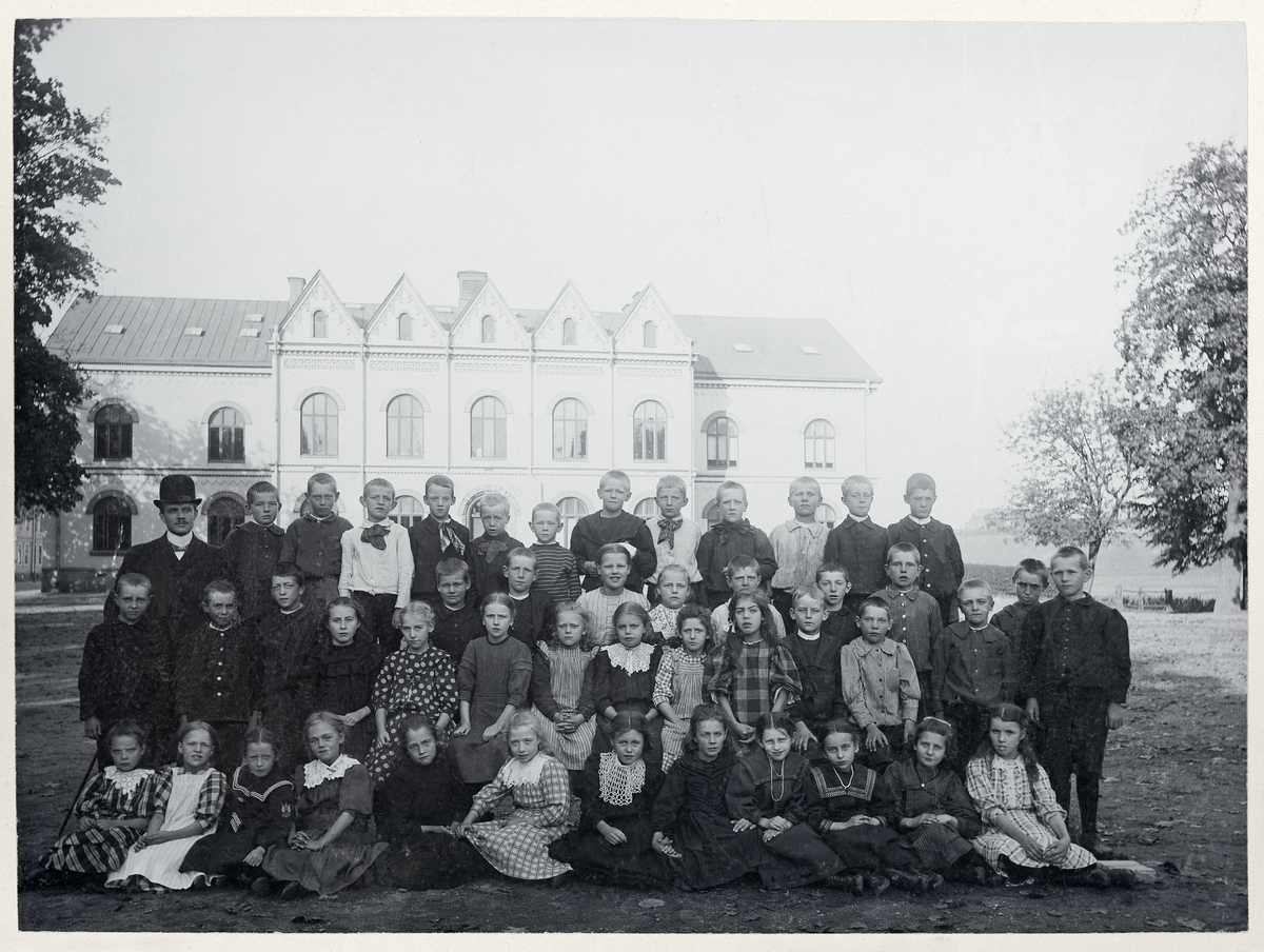 En folkskoleklass med klassföreståndare på skolgården till Norrtullskolan, Växjö.