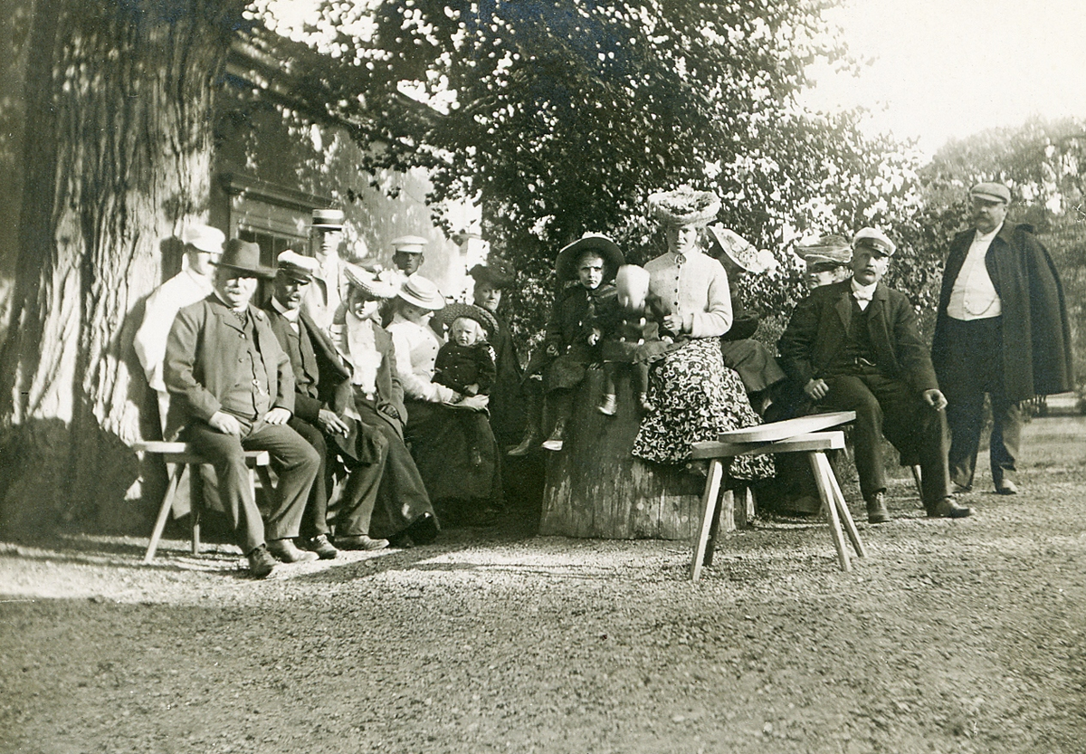 Andre man på bänken t. v. är kronolänsman Albert Bergstedt. Lite längre bort syns hans fru Elisabeth Bergstedt med dottern Margareta.