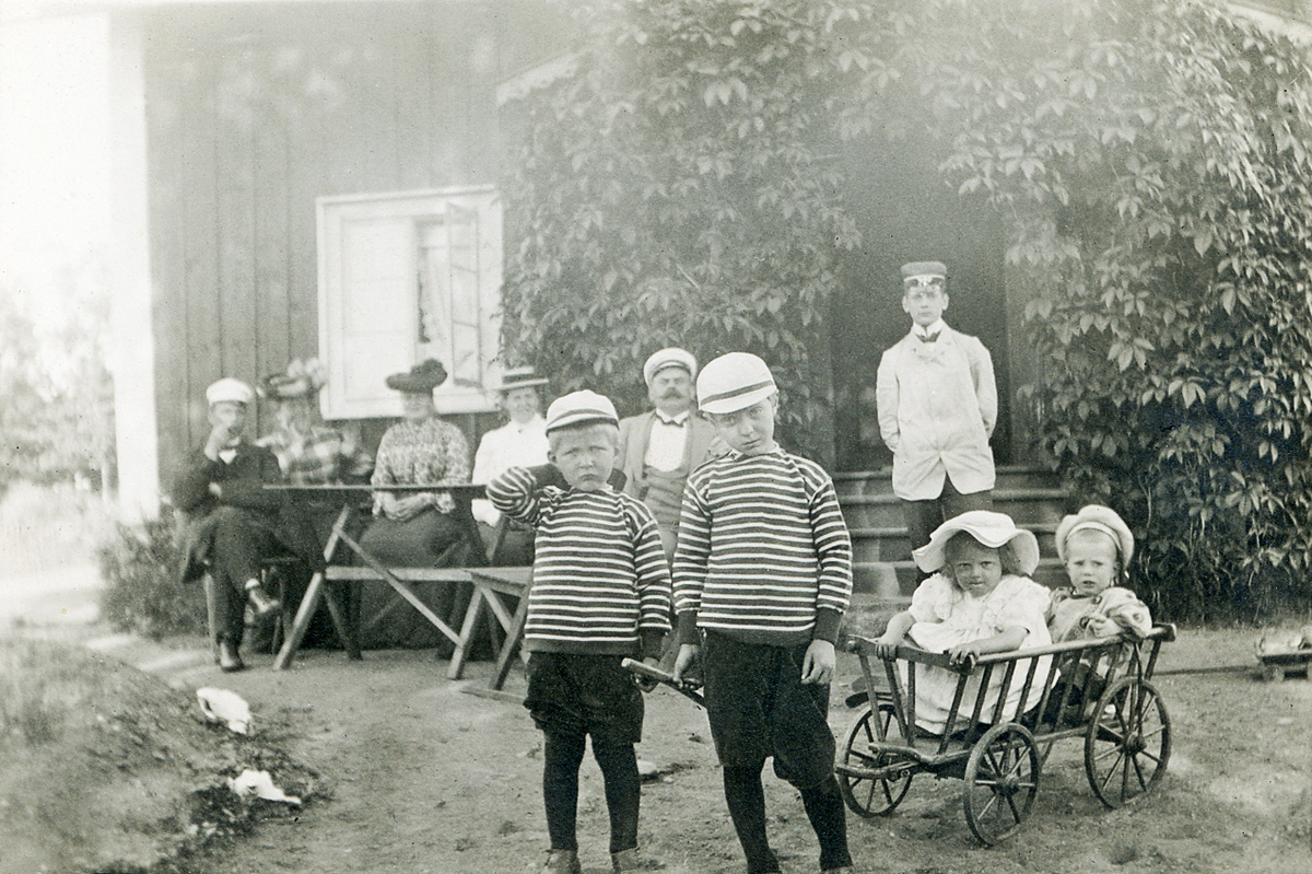 Mellan de två pojkarna i randiga tröjor syns stadsfiskal Filip Rehnström. Flickan i kärran är Margareta Bergstedt.