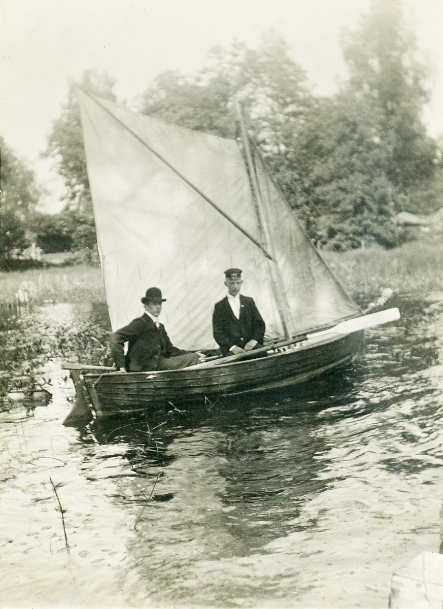Två unga män i en segeljolle, trol. någonstans på Helgasjön.