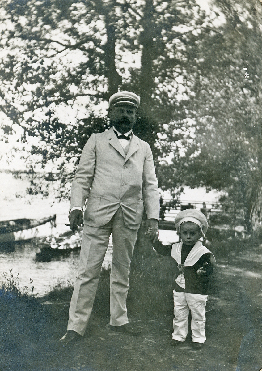 Stadsfiskal Filip Rehnström i sommarkostym med en av hans pojkar i 2:a äktenskapet, trol. Nils Gustaf R. (1903-1993) eller Sven Göte R. (1905-1949), vid en sjökant trol. på Evedal, Växjö. I bakgrunden syns en del av en brygga med några båtar.