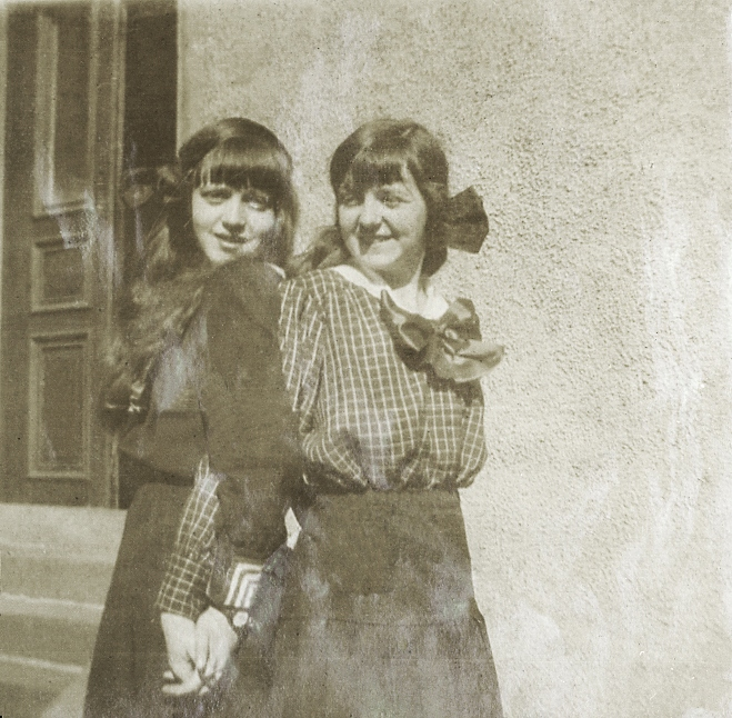 Två flickor, den ena i mörk sjömansklänning den andra i blus och kjol, poserar utanför ett bostadshus, trol. någonstans