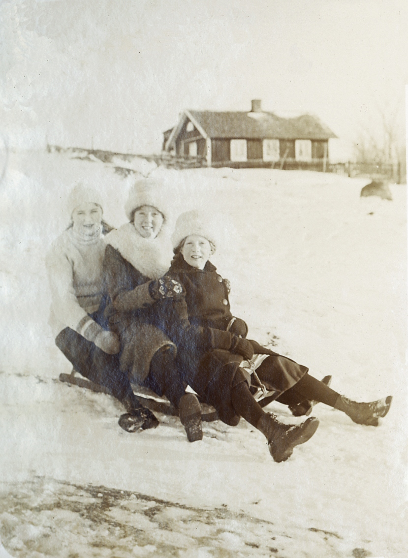 Tre glada tonårsflickor på en kälke. I bakgrunden syns ett bostadshus bakom en häck.