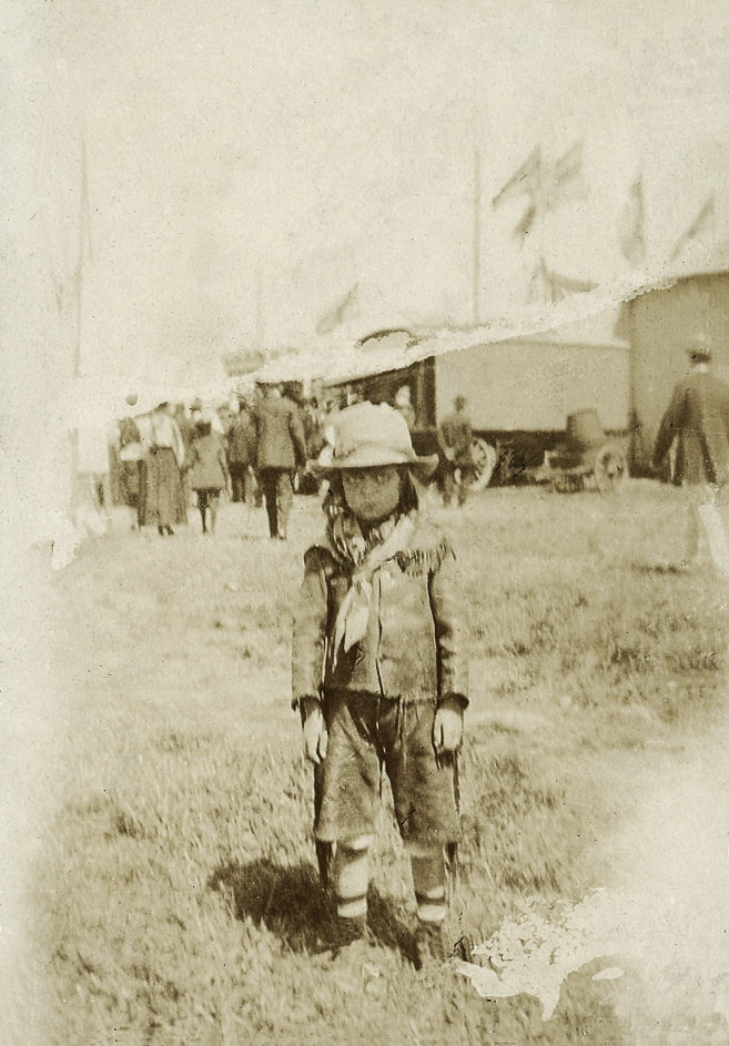 En liten pojke i kortbyxor och stor hatt utanför en cirkus, trol. i Växjö.