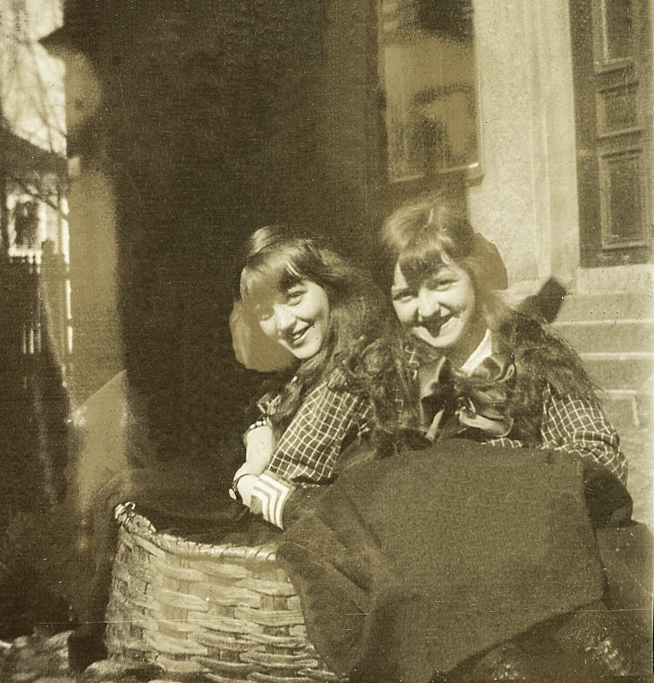 Två tonårsflickor (systrar ?) i blus och kjol vid en vedkorg på en bakgård.