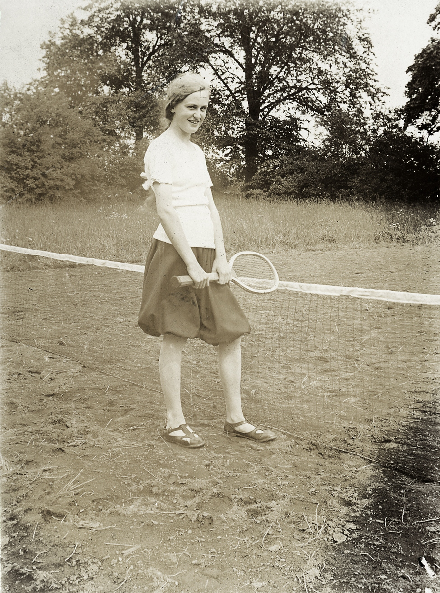 En tonårsflicka i gymnastikdräkt. Hon håller ett tennisracket och verkar vara redo att börja spela.