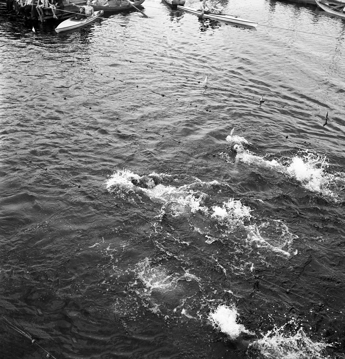 Simningen. Vy över tävlingsbassängen, under tävling.