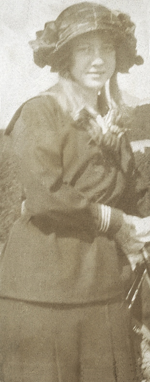 En tonårsflicka poserar i hatt och mörk sjömansklänning.