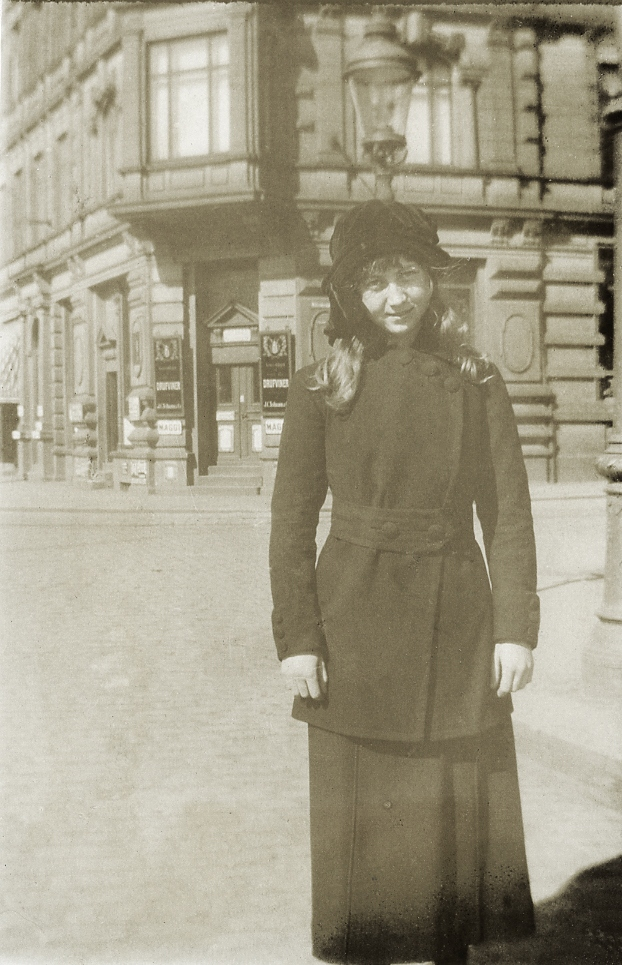En tonårsflicka i halvlång kappa och hatt poserar i ett gathörn, möjl. i Stockholm.