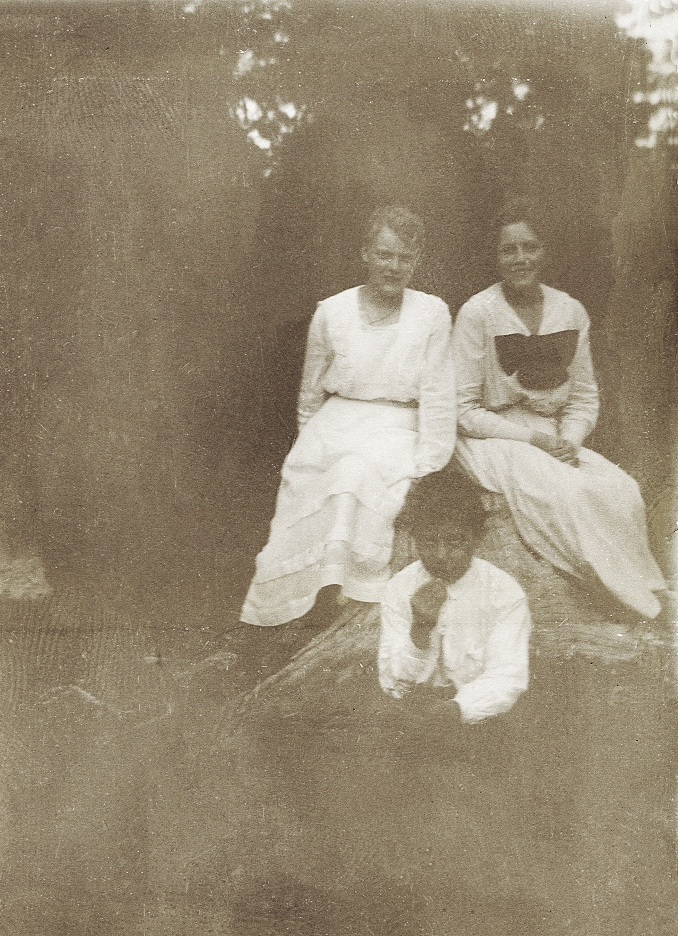 Tre tonårsflickor i vita sommarkläder poserar för fotografen.