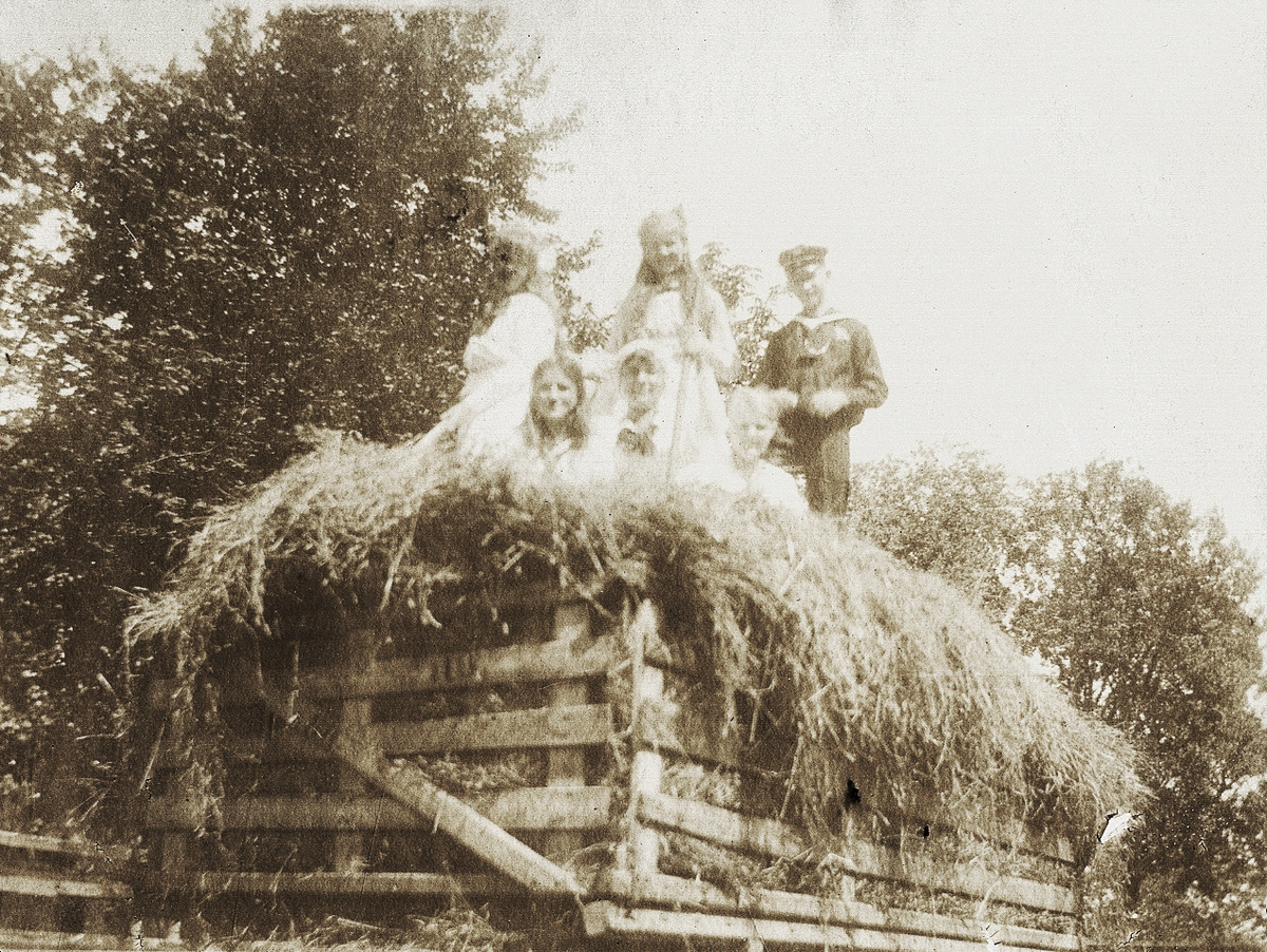 Fyra tonårsflickor och en pojke på ett hölass, trol. i Gårdsby.