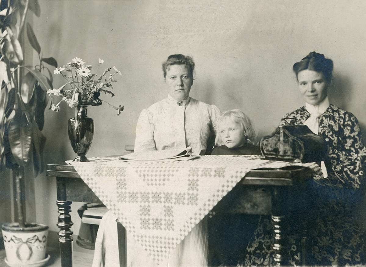 Fru Elisabeth Bergstedt, dottern Margareta och fru Mathilda Rehnström sitter på en dyschatell med ett spelbord framför sig.