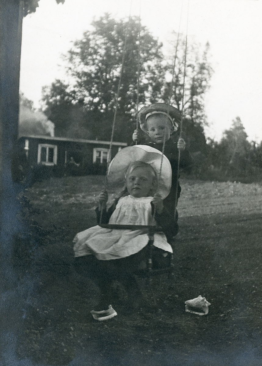 En liten flicka (Margareta Bergstedt) och en pojke på en gunga.