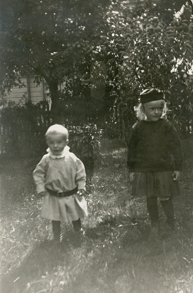 En liten pojke i kolt och en liten flicka (Margareta Bergstedt) i en trädgård.