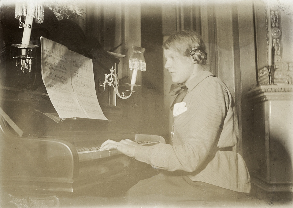 En tonårsflicka spelar piano i ett vardagsrum.
