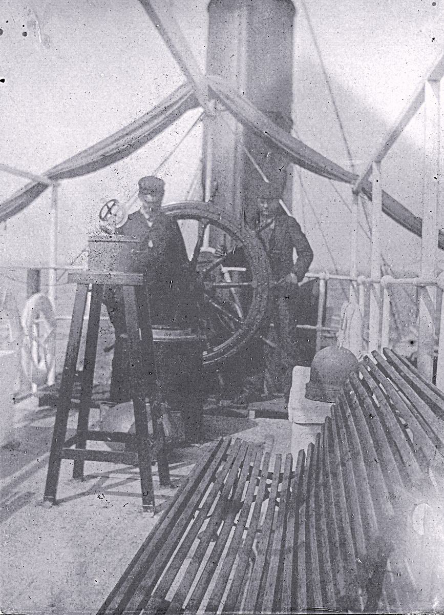 Foto av två sjömän ombord på en båt. Bildtext i album: "..med kurs på England".
