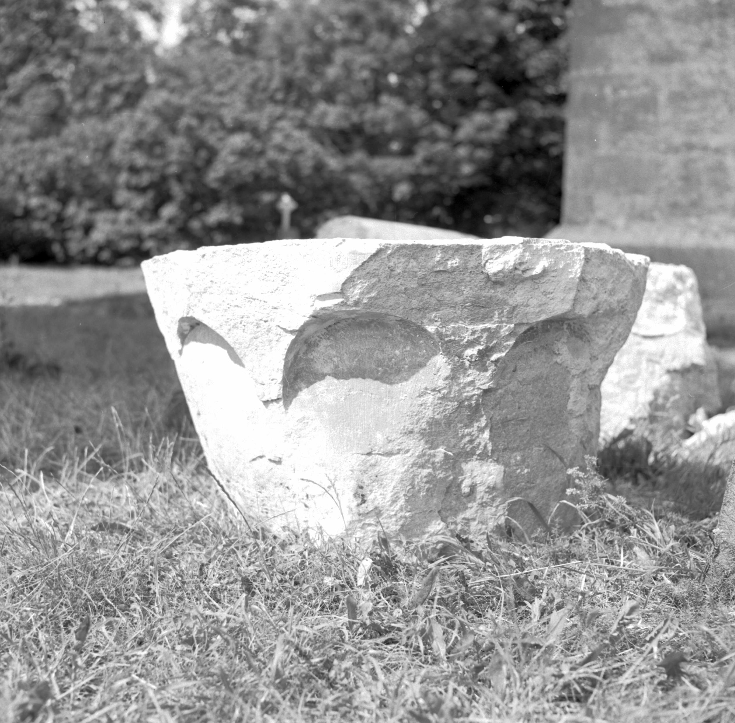Pelarskaftets nedersta trumma med spår av bladkrans. Trumman ligger upp och ner. Foto nr. 10.