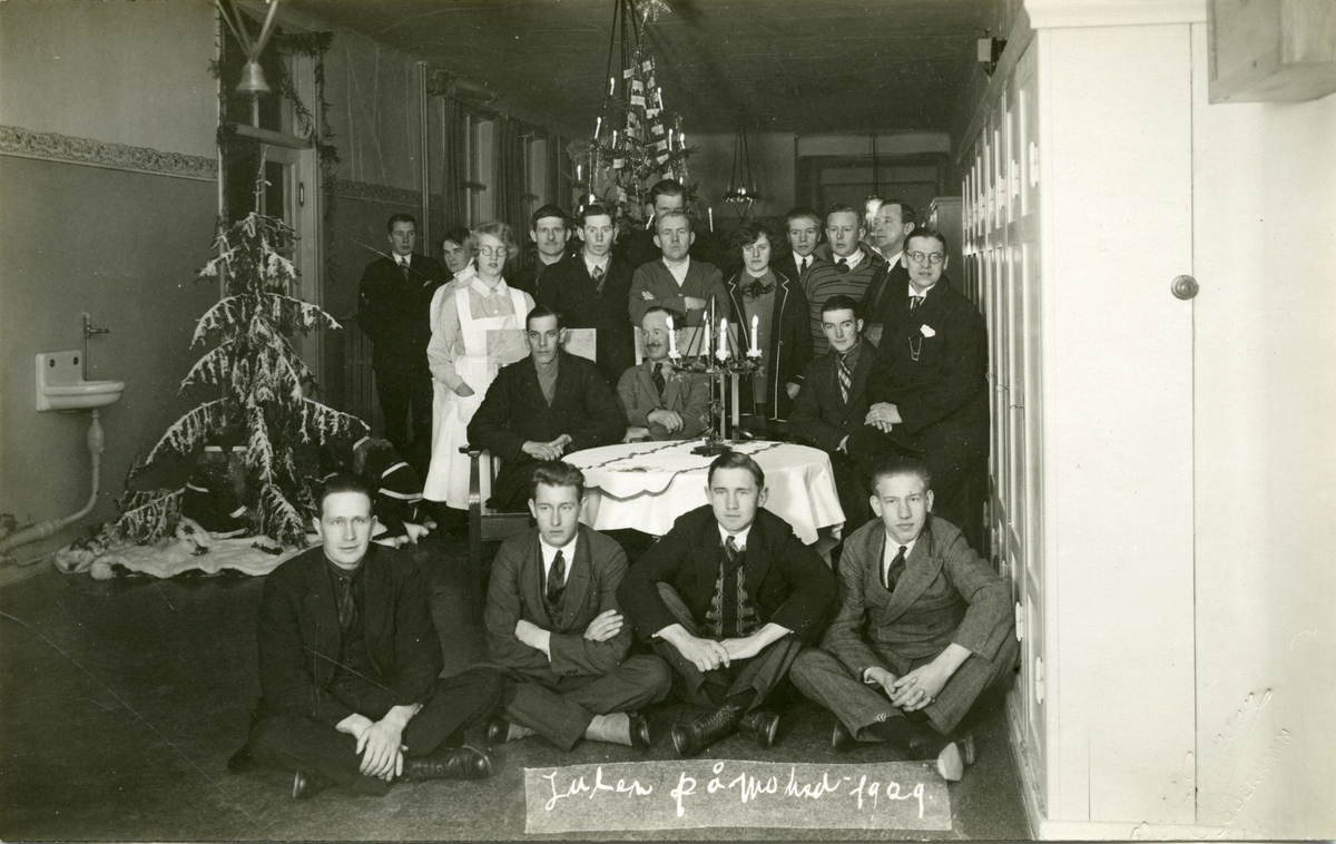 Titel: En grupp kvinnor och män, troligen personal, som firar jul på Moheds sanatorium. Text på framsida kort: "Julen på Mohed 1929".