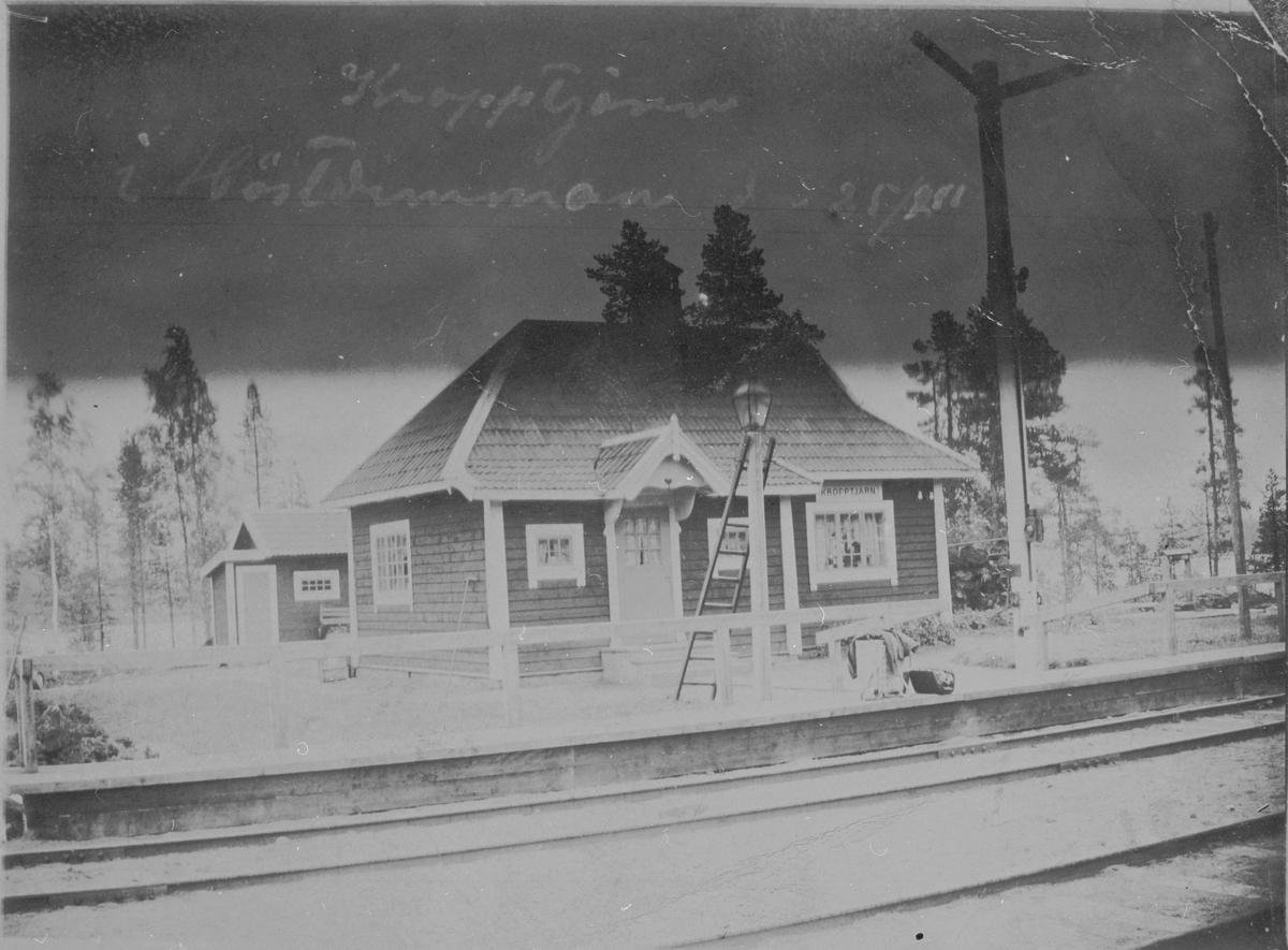 Banvaktstugan vid Kropptjärn med dess uthus bakom stugan samt plattform och semafor framför.