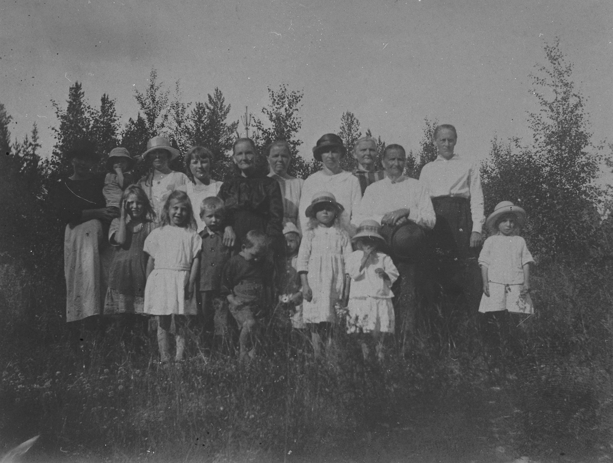 Kvinnor och barn uppställda för gruppfoto, utomhus.