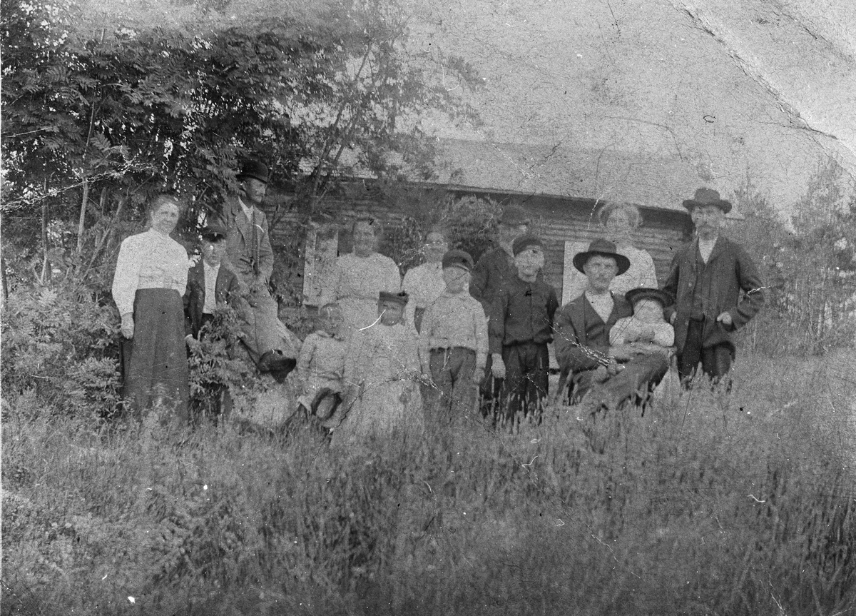 Ett stort sällskap, utanför stuga.