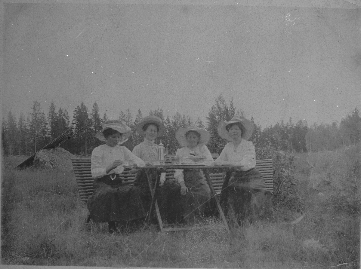 Grupp kvinnor med hattar som dricker kaffe, utomhus.
