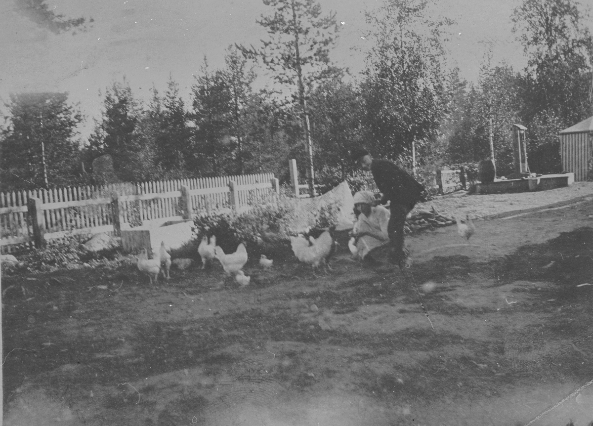 En kvinna och en pojke, som matar höns