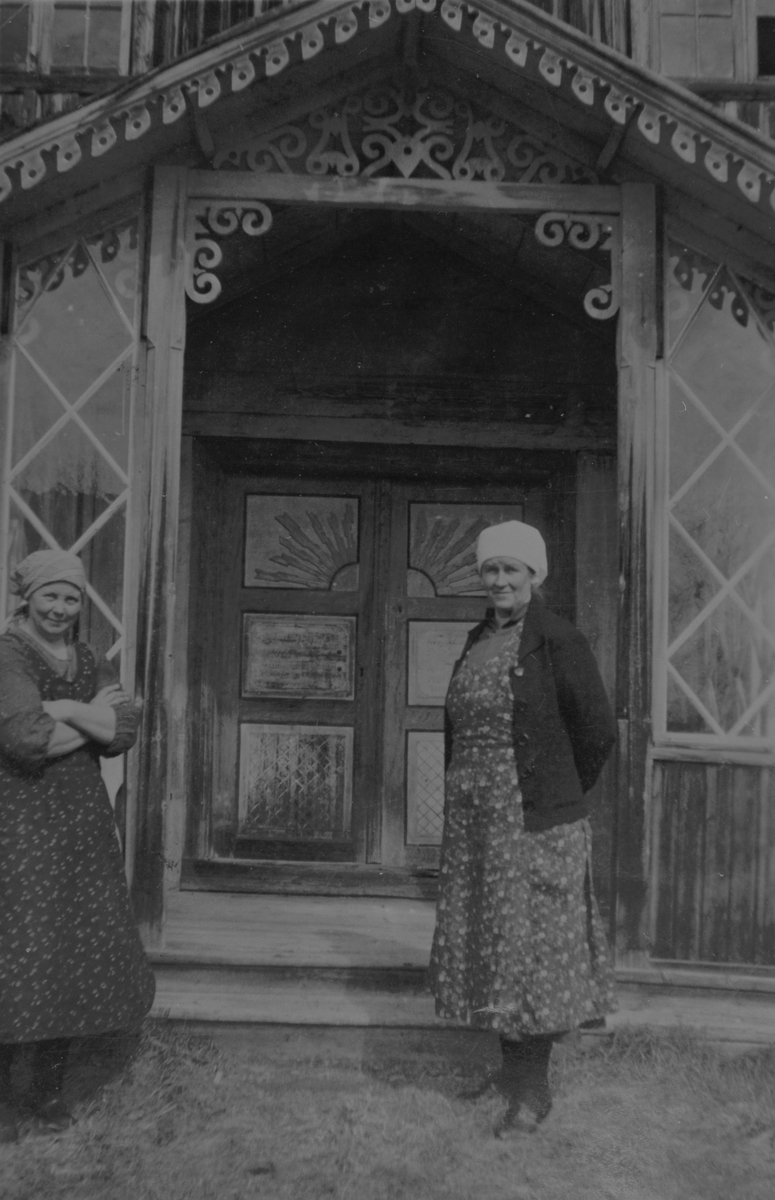 Två kvinnor, utanför bron vid Fågelsjö gammelgård, " Bortom Åa".
