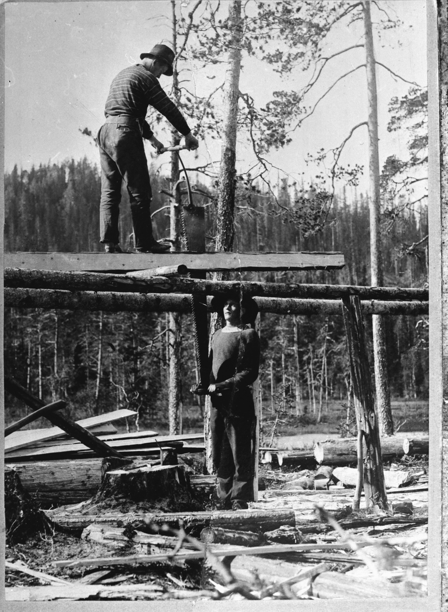Kapningen utförs av två fågelsjöbor. Kransågen var huggen att den tog bara då den drogs nedåt.Den som stod överst skulle under arbetet hålla balansen och dra upp sågen.
