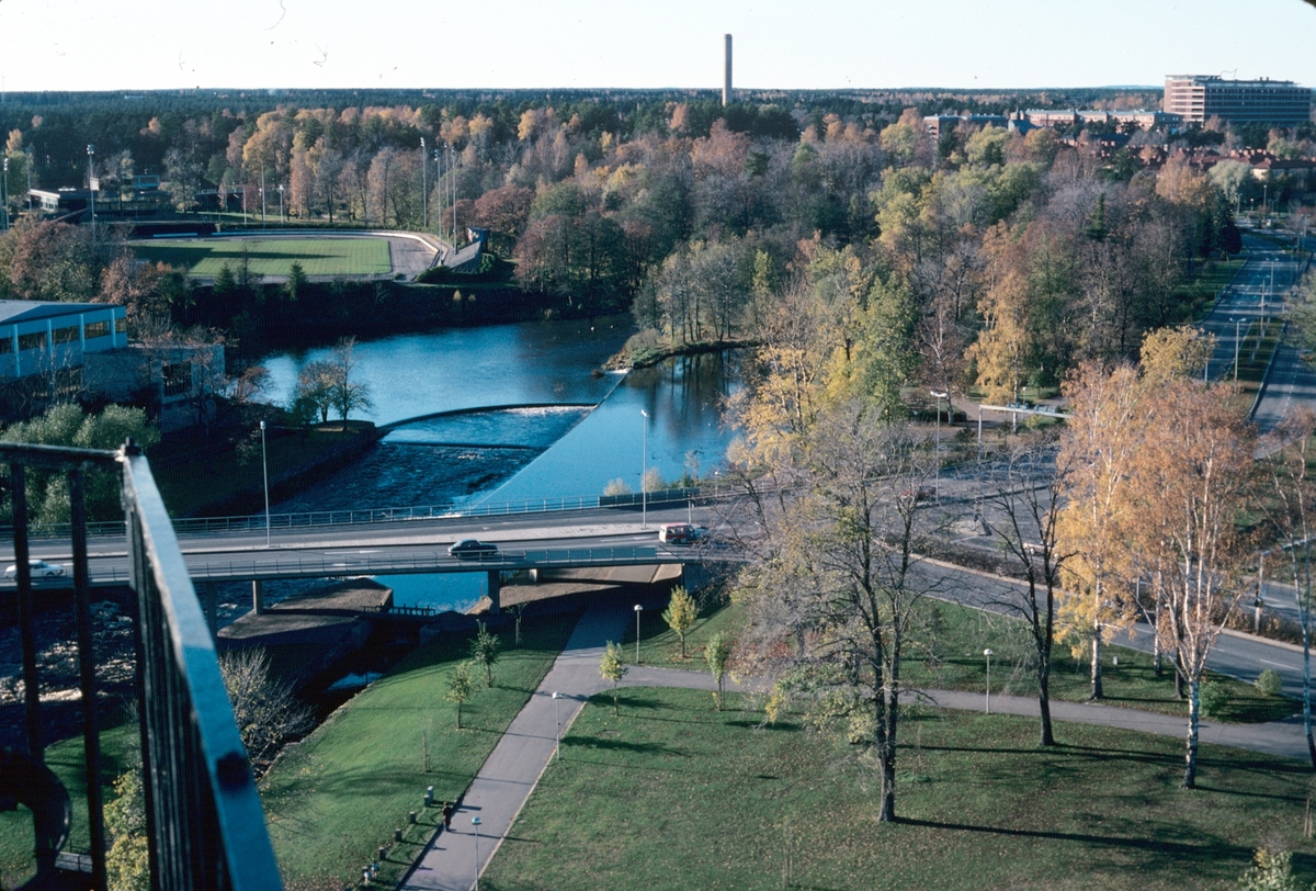 Stadsvy över Gävle västerut med en del av Strömbadet på vänstersida, Strömvallen. Framtill Kvarnparken och Stadsträdgården. Utsikt från kyrktornet i Helige Trefaldighet kyrkan