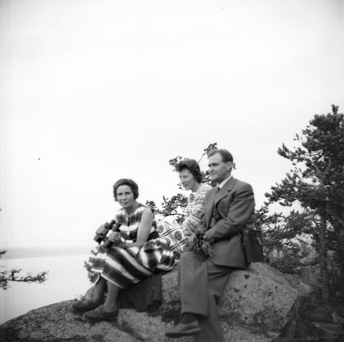 Två kvinnor och en man sitter på stenklippa vid vattnet