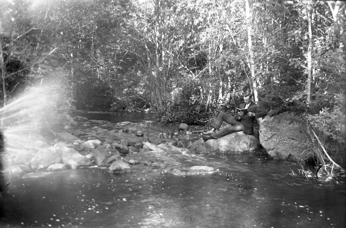 Läsande man vid vattendrag.