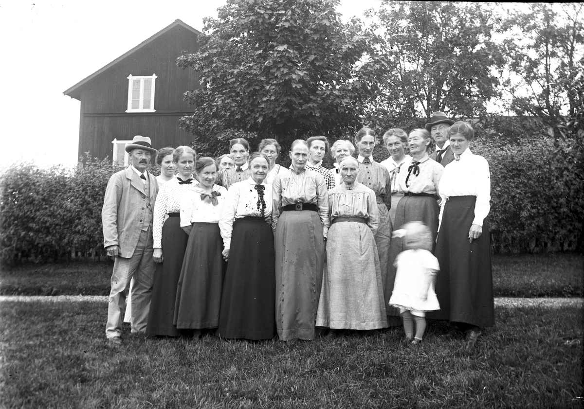 John Hillström längst till vänster, Margta Hillström trea från vänster. I trädgården i Östby med ladugården i bakgrunden.