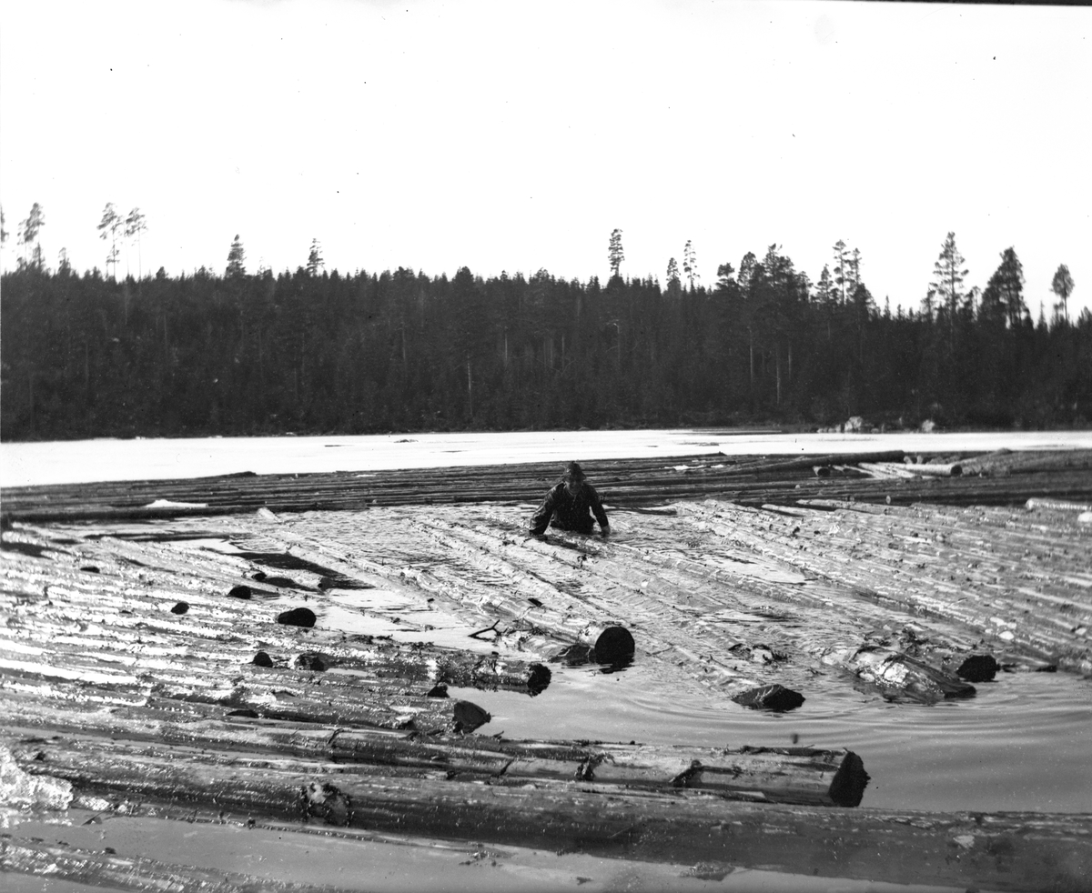 Man vid timmerflottnig.