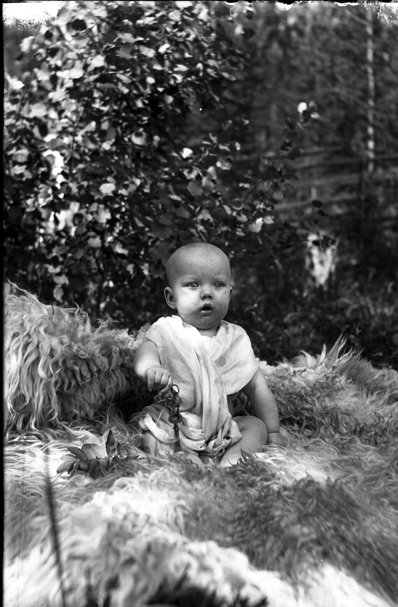 Barn sitter på fårskinn.