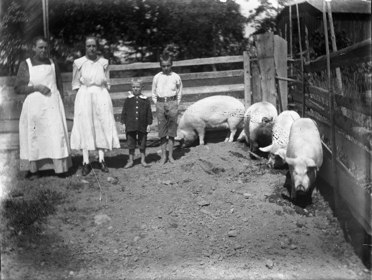 Kvinnor och barn i svinstia.
