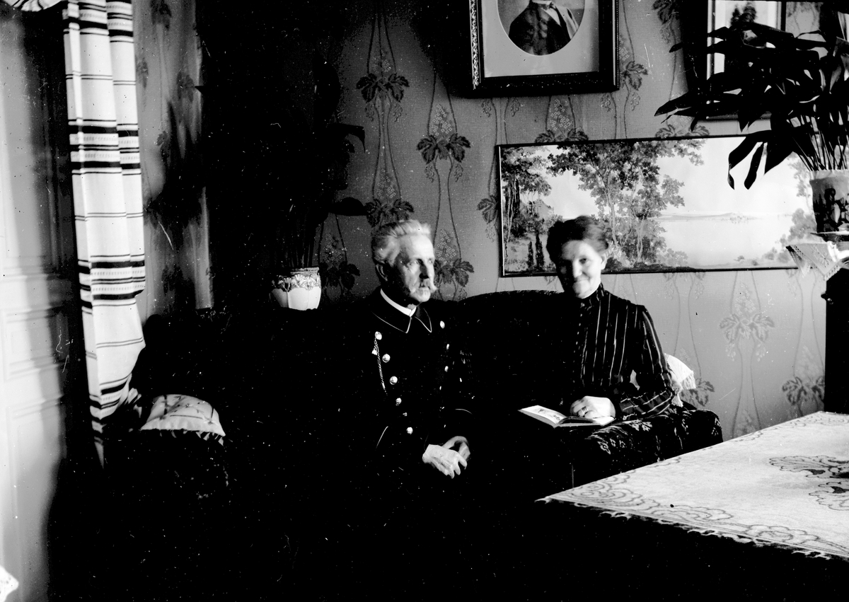 Sitter i soffan. Tidsomfånget är 1900 - 1940