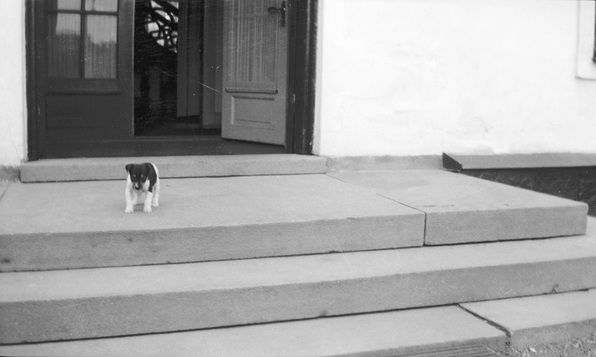 Tolvfors Herrgård, hundvalp på trappan. Tidsomfånget är 1900 - 1940