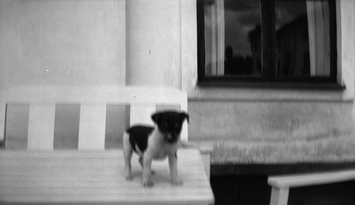 Tolvfors Herrgård, hundvalp på trädgårdsmöbeln. Tidsomfånget är 1900 - 1940