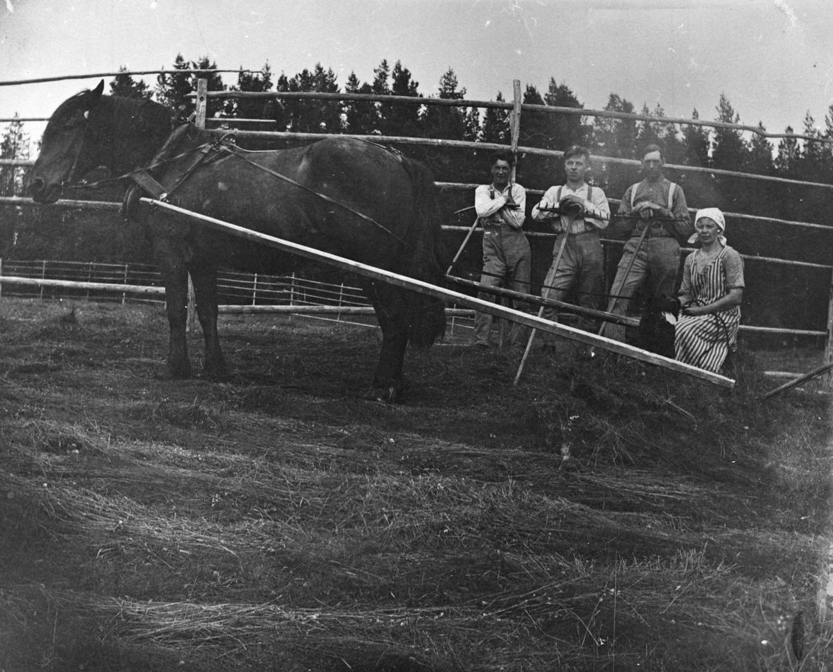 En grupp, som hässjar och samlar ihop höet, med en arbetshäst.