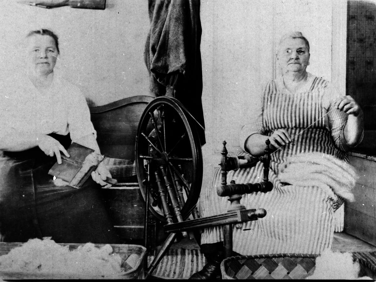 Två kvinnor som kardar och spinner.