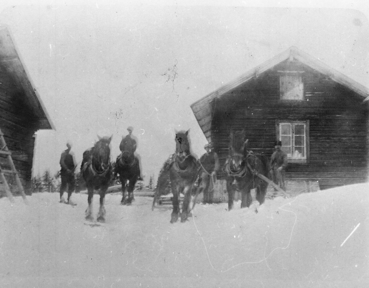 En grupp män med hästar och hästslädar på Näveråsvallen, Orsa Finnmark, Gävleborg.