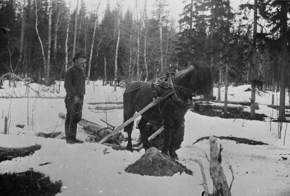 En man med häst släde med timmer.