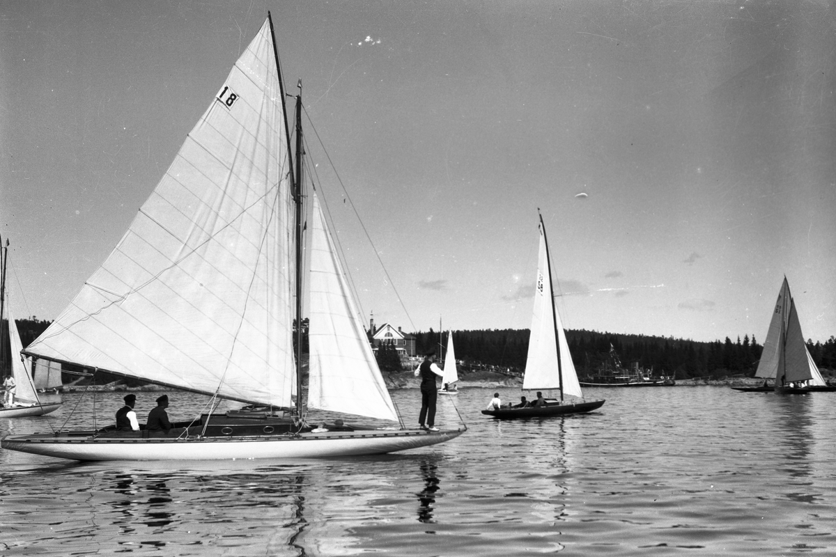 Gävle Segelsällskap. År 1925. Norrlandsregattan i Sundsvallsfjärden, bl.a. runt Alnön. I bakgrunden Sundsvall Segelsällskaps klubbhus Vindhem på Alnön.