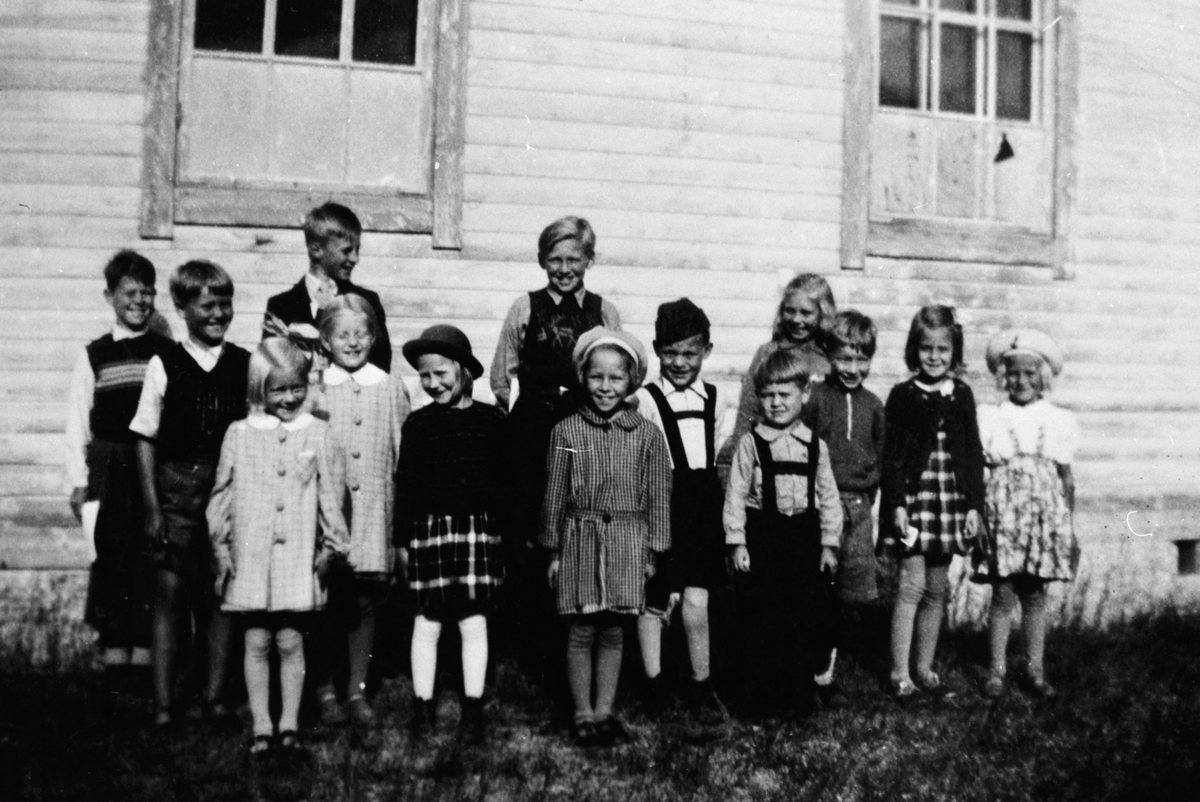 En grupp yngre barn, utanför ett hus.