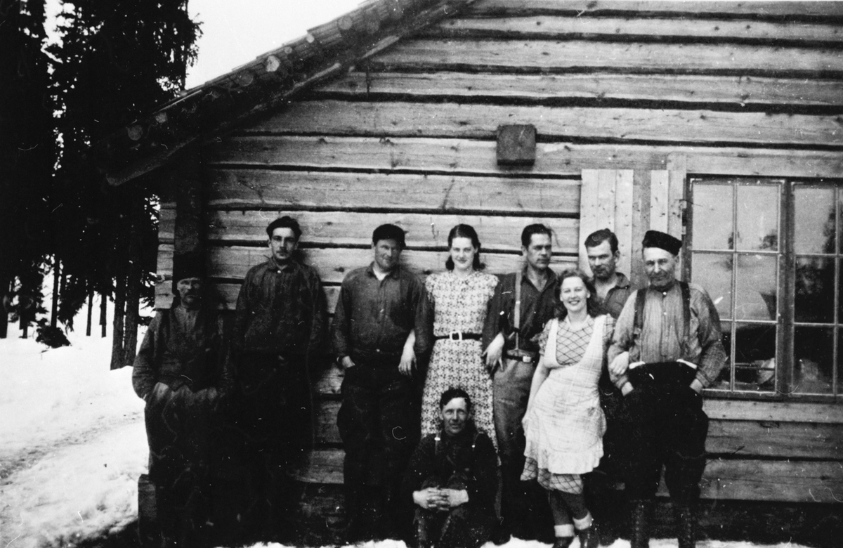 Sju män och två kvinnor, utanför en stuga för fotografering.