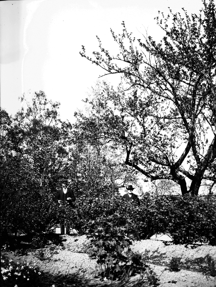 Knut och Johansson i trädgården. Åby. Den 10 juni 1906.