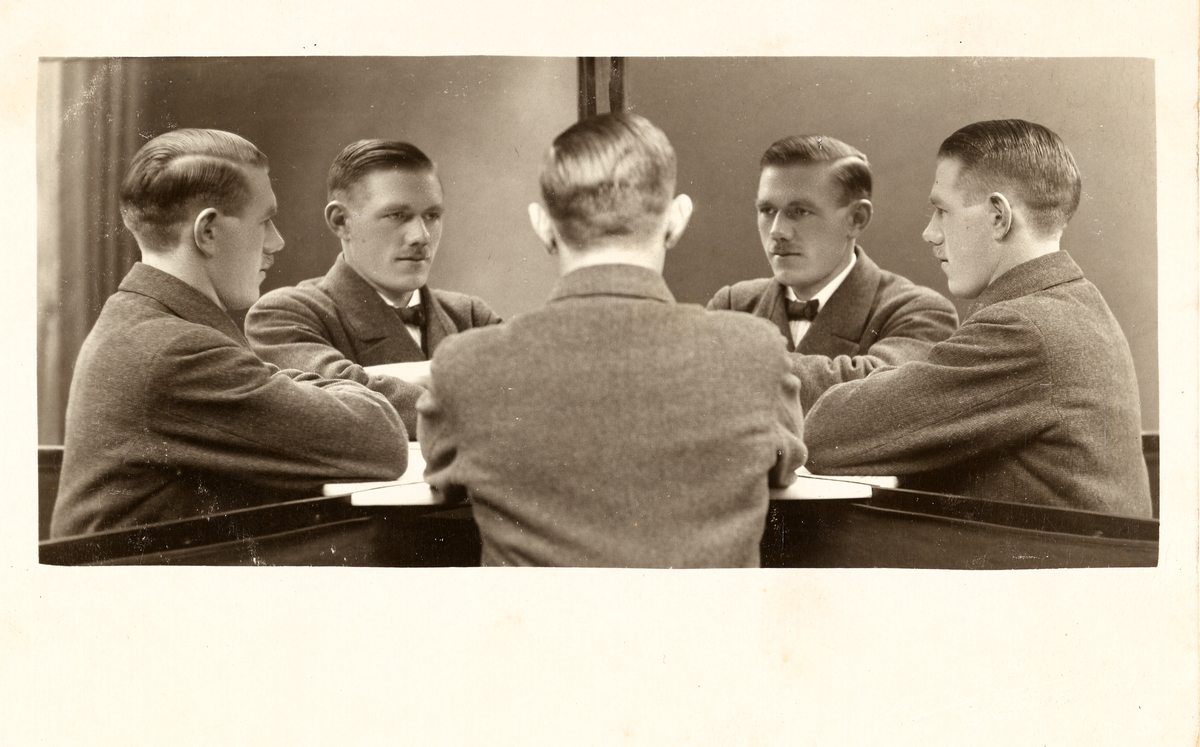 Porträtt av man vars spegelbild blir fyrdimensionell.
