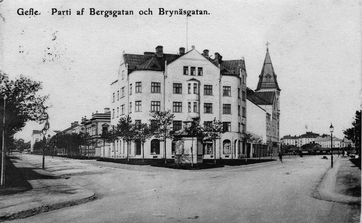 Parti av Bergsgatan och Brynäsgatan. Ett brevkort till Herr A. A. Bylund, Stockholm. Från Mimmi med texten "De varmaste hälsningar på "Anders" från oss alla". Den 29 november 1907. Skräddarmästaren Anders August Bylund född i Västernorrlands län 1844-05-03, död 1925-12-31.